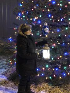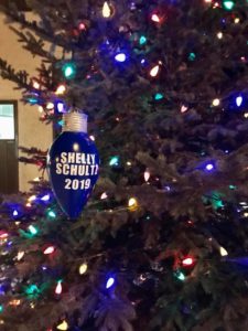 Carol then presented Shelly with the official “Tree Lighting Ornament” and a small keepsake to say thank you. This year the ornament , along with those of the previous five Tree Lighters, will hang on a lighted wire next to the Christmas Tree.