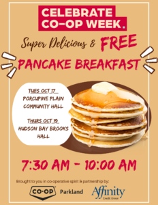 Co-op Week Pancake Breakfast Posted on October 3, 2023 by Porcupine Plain CDO Calendar When: October 17, 2023 @ 7:30 am – 10:00 am 2023-10-17T07:30:00-06:00 2023-10-17T10:00:00-06:00 Where: Porcupine Plain Community Hall Cost: Free Contact: Parkland Co-op