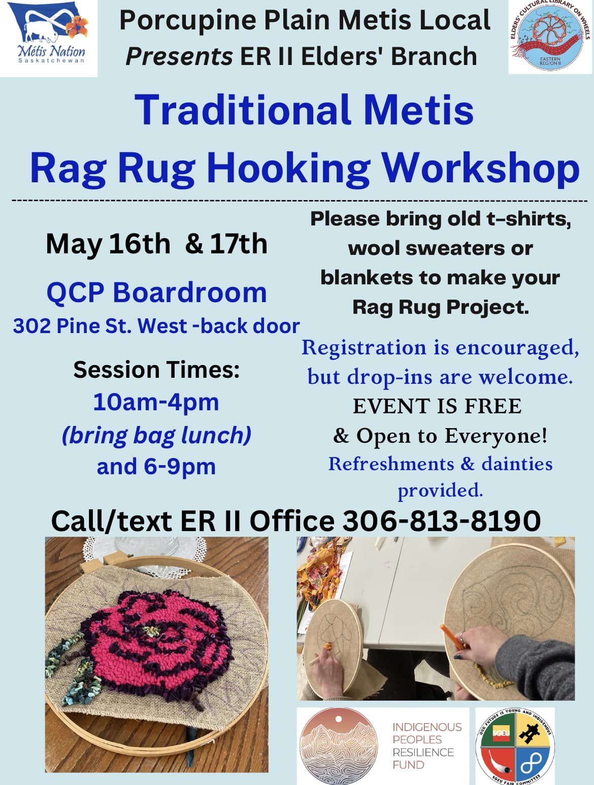 Rag Rug Hooking Workshop Posted on May 2, 2023 by Porcupine Plain CDO Calendar When: May 16, 2023 – May 17, 2023 all-day 2023-05-16T00:00:00-06:00 2023-05-18T00:00:00-06:00 Where: Quilly's Community Place (QCP) - Meeting Room Cost: Free Contact: Metis Nation Saskatchewan Eastern Region II 3068138190